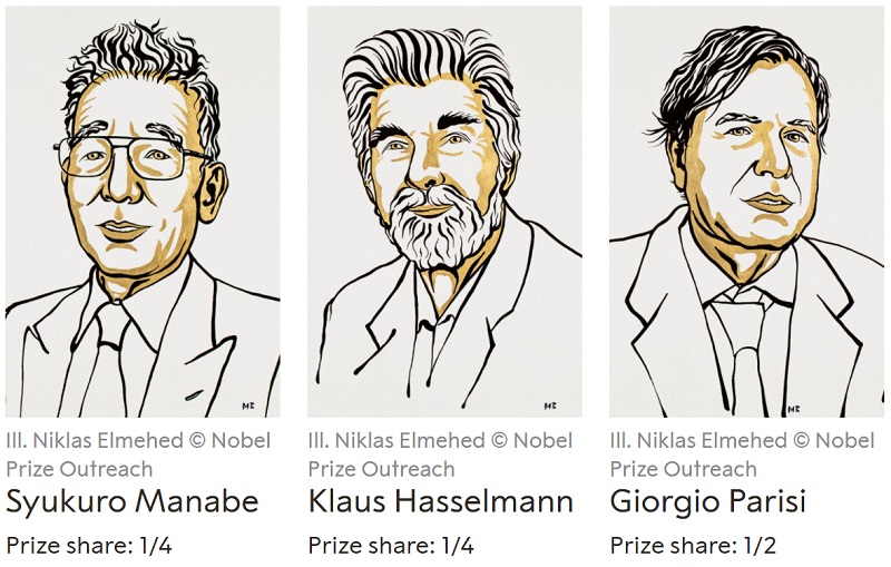 Το μισό Νόμπελ Φυσικής 2021 μοιράζονται οι Syukuro Manabe και Klaus Hasselmann «για την φυσική μοντελοποίηση του κλίματος της Γης, την ποσοτικοποίηση της μεταβλητότητας και την αξιόπιστη πρόβλεψη της υπερθέρμανσης του πλανήτη» και το άλλο μισό στον Giorgio Parisi «για την ανακάλυψη της αλληλεπίδρασης της αταξίας και των διακυμάνσεων στα φυσικά συστήματα από τις ατομικές έως τις πλανητικές κλίμακες»