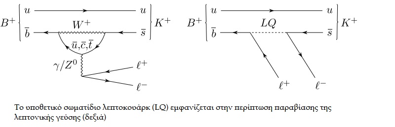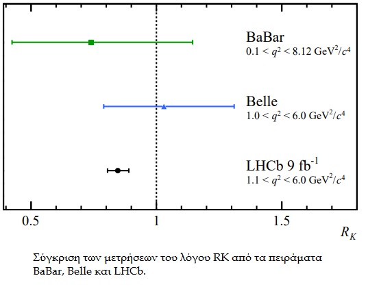 ightarrow K^{+}ell^{+} ell^{-}. Ενώ, σύμφωνα με το Καθιερωμένο Πρότυπο των στοιχειωδών σωματιδίων είναι εξίσου πιθανό να διασπαστούν σε ηλεκτρόνια ή μιόνια, τα αποτελέσματα των αναλύσεων δείχνουν ότι η φύση προτιμά τα ηλεκτρόνια από τα βαρύτερα μιόνια. Έτσι, η τιμή του λόγου RK βρέθηκε μικρότερη της μονάδας:
