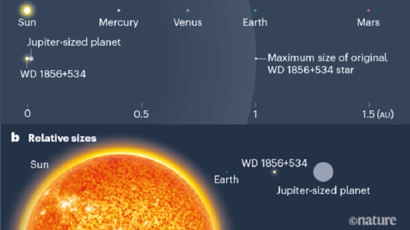 Ο πλανήτης με την ονομασία WD 1856b, που έχει θερμοκρασία έως 17 βαθμών Κελσίου (περίπου η μέση θερμοκρασία στη Γη), εκτιμάται ότι έχει μέγεθος μεγαλύτερο ακόμη και από τον Δία, τον μεγαλύτερο πλανήτη του δικού μας ηλιακού συστήματος, ενώ ευρίσκεται σε απόσταση 80 ετών φωτός από τη Γη, στο βόρειο αστερισμό του Δράκοντα. Η ιδιομορφία είναι ότι το γέρικο μητρικό άστρο του, ένας λευκός νάνος ηλικίας σχεδόν έξι δισεκατομμυρίων ετών, δεν είναι μεγαλύτερο από τη Γη, αν και διαθέτει συμπυκνωμένη τη μισή μάζα του Ήλιου. Συνεπώς ο πλανήτης -πιθανότατα αέριος όπως ο Δίας- είναι πολύ μεγαλύτερος από το ίδιο το άστρο του, κάτι ιδιαίτερα ασυνήθιστο.