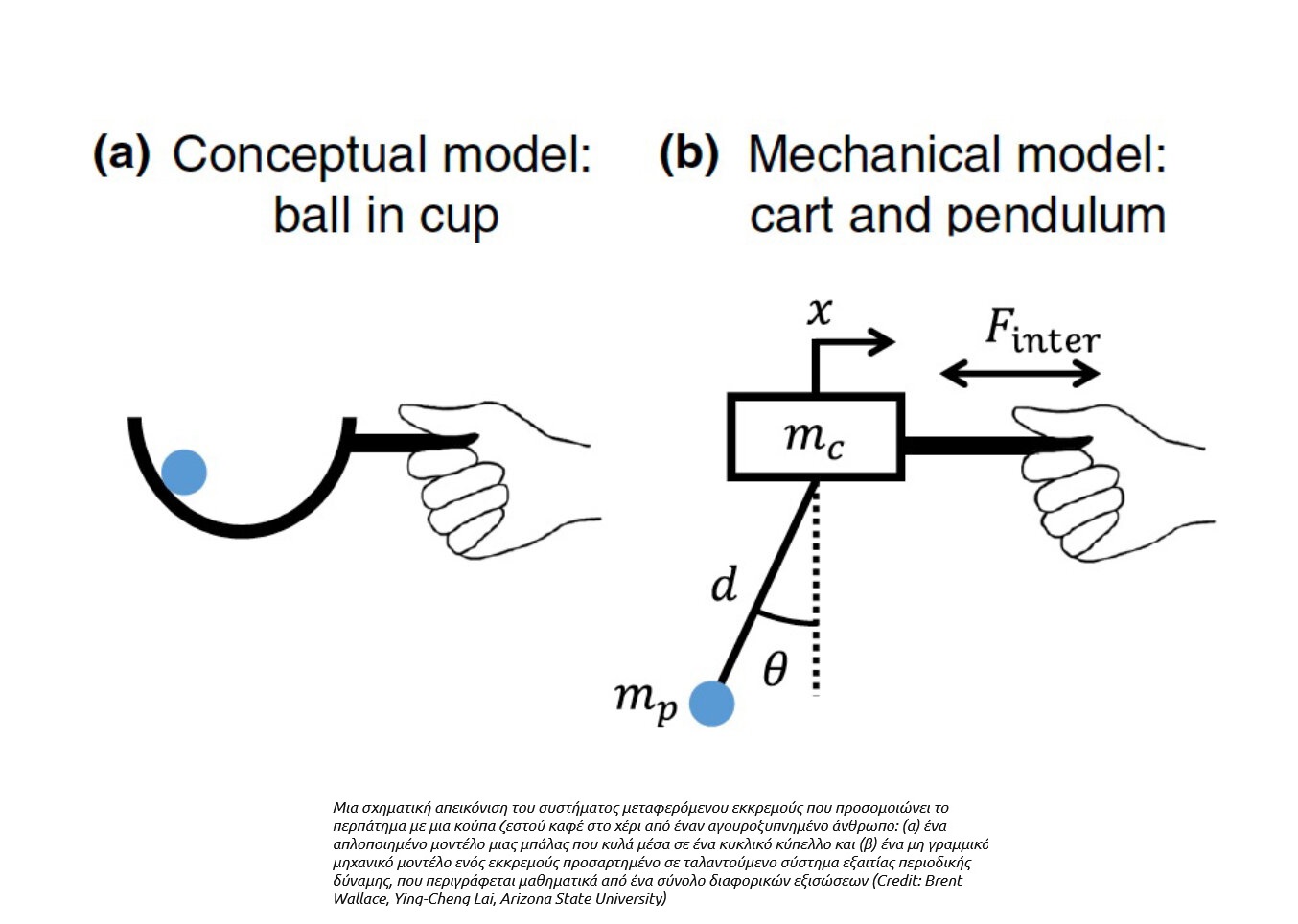 Η νέα δημοσίευση των ερευνητών Wallace et al στο περιοδικό Physical Review Applied, με τίτλο «Synchronous Transition in Complex Object Control» , περιγράφει μια εικονική πειραματική μελέτη που εξετάζει το πως οι άνθρωποι χειρίζονται ένα πολύπλοκο αντικείμενο. Προσομοιώνοντας τον καφέ της κούπας με μπίλια που κυλάει στο εσωτερικό κυκλικής κούπας (βλέπε εικόνα), οι συμμετέχοντες έστρεφαν κατάλληλα την κούπα με ρυθμικό τρόπο μεταβάλλοντας δύναμη και συχνότητα ώστε να εξασφαλίσουν ότι η μπίλια θα παραμείνει στην κούπα. Η μελέτη έδειξε ότι οι συμμετέχοντες μπορούν να επιλέγουν είτε στρατηγική χαμηλής συχνότητας είτε υψηλής συχνότητας (όσον αφορά την ταλαντωτική κίνηση της κούπας) – για τον χειρισμό ενός σύνθετου αντικειμένου.