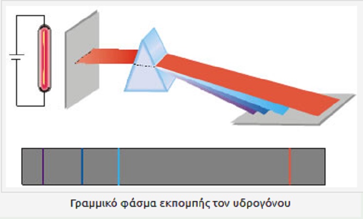 «Όταν εφαρμόσουμε ορισμένη τάση σε γυάλινο σωλήνα που περιέχει αέριο σε χαμηλή πίεση (όπως στις διαφημιστικές λυχνίες νέου), τότε θα παρατηρήσουμε ότι το αέριο εκπέμπει φως. Αν το φως αυτό αναλυθεί, όταν, για παράδειγμα, περάσει μέσα από ένα γυάλινο πρίσμα, τότε θα παρατηρήσουμε μια σειρά από φωτεινές γραμμές. Κάθε γραμμή αντιστοιχεί σε ένα διαφορετικό μήκος κύματος ή χρώμα. H σειρά των γραμμών που παρατηρούνται ονομάζεται γραμμικό φάσμα εκπομπής του αερίου.
