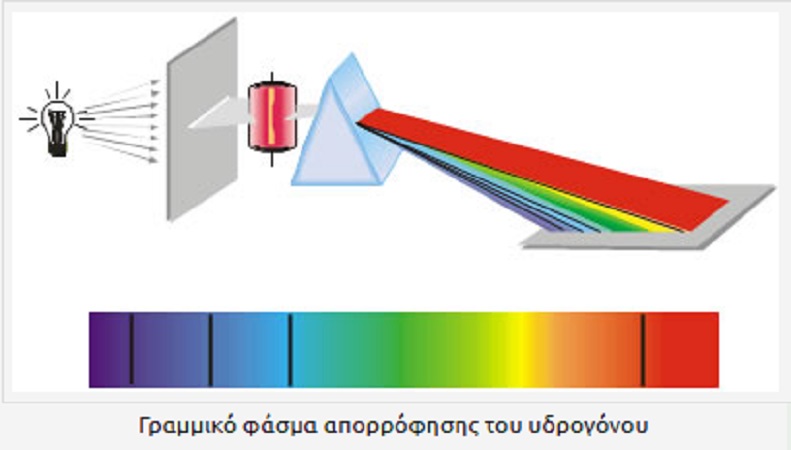 Αν τώρα ανάμεσα στην πηγή του λευκού φωτός και στο πρίσμα τοποθετηθεί γυάλινο δοχείο που περιέχει κάποιο αέριο, τότε θα παρατηρήσουμε ότι η χρωματιστή ταινία διακόπτεται από σκοτεινές γραμμές. Η ταινία αυτή των χρωμάτων ονομάζεται γραμμικό φάσμα απορρόφησης του αερίου. Οι σκοτεινές γραμμές εμφανίζονται σε εκείνες ακριβώς τις συχνότητες στις οποίες εμφανίζονται οι φωτεινές γραμμές του φάσματος εκπομπής του ίδιου αερίου.