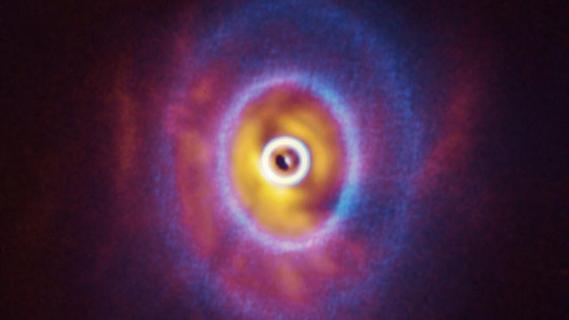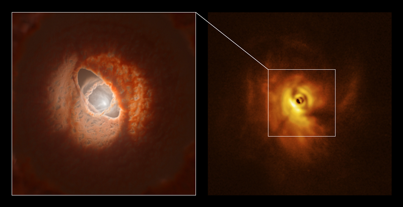 Αυτός ο στρεβλωμένος σπασμένος δακτύλιος, που βρίσκεται στο εσωτερικό μέρος του περιαστρικού δίσκου του συστήματος GW Orionis, περιέχει 30 γήινες μάζες σε σκόνη. Αυτό σημαίνει ότι ο δίσκος περιέχει αρκετό υλικό για να σχηματίσει πολλούς πλανήτες και δακτυλίους πυκνής αστρικής σκόνης που φώλιαζαν μεταξύ των τριών άστρων.
