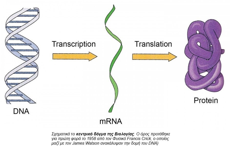 Σύμφωνα με το κεντρικό δόγμα της Βιολογίας η γενετική πληροφορία μεταγράφεται με ακρίβεια από το DNA στο RNA και στη συνέχεια μεταφράζεται σε πρωτεΐνες. Που σημαίνει ότι οι πληροφορίες που περιέχει το DNA αντιγράφονται σε μόρια RNA τα οποία με τη σειρά τους δίνουν εντολή για την παραγωγή πρωτεϊνών.