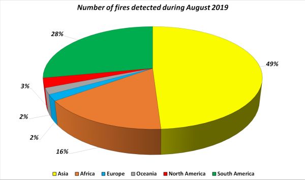 Τα δεδομένα αποκαλύπτουν ότι το 49% των φωτιών ανιχνεύθηκαν στην Ασία, γύρω στο 28% ανιχνεύτηκαν στη Νότια Αμερική, 16% στην Αφρική και το εναπομένον ποσοστό καταγράφηκε στη Βόρεια Αμερική, την Ευρώπη και την Ωκεανία.