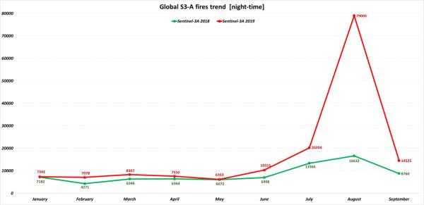Την τάση των πυρκαγιών που ανιχνεύτηκαν το 2019 δείχνει το γράφημα με κόκκινο χρώμα, ενώ αυτή των πυρκαγιών του 2018 τη δείχνει με πράσινο. Ο Παγκόσμιος Άτλας Πυρκαγιών Sentinel-3 δείχνει 79.000 φωτιές τον Αύγουστο του 2019, σε σύγκριση με μόλις πάνω από 16.632 τον Αύγουστο του 2018.