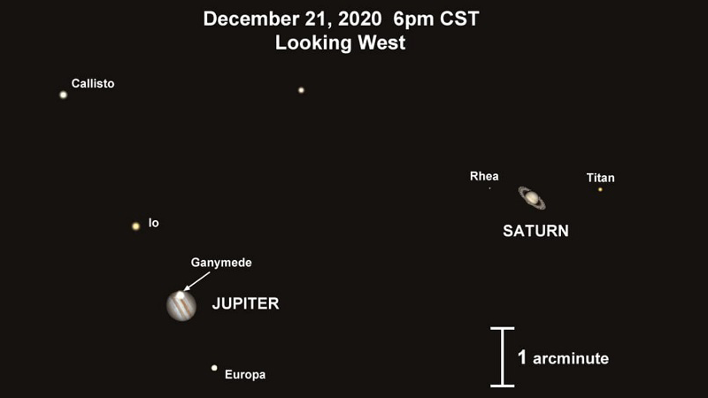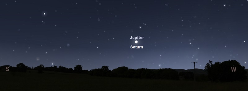 Οι δύο πλανήτες προσεγγίζουν ο ένας τον άλλο στον ουρανό της Γης ήδη από φέτος το καλοκαίρι και στις 21 Δεκεμβρίου θα τους χωρίζει φαινομενικά μόνο το ένα πέμπτο της διαμέτρου της Σελήνης. Εκείνο το βράδυ, τόσο οι δύο πλανήτες όσο και αρκετοί από τους μεγαλύτερους δορυφόρους τους θα είναι ορατοί ταυτόχρονα από τα τηλεσκόπια.