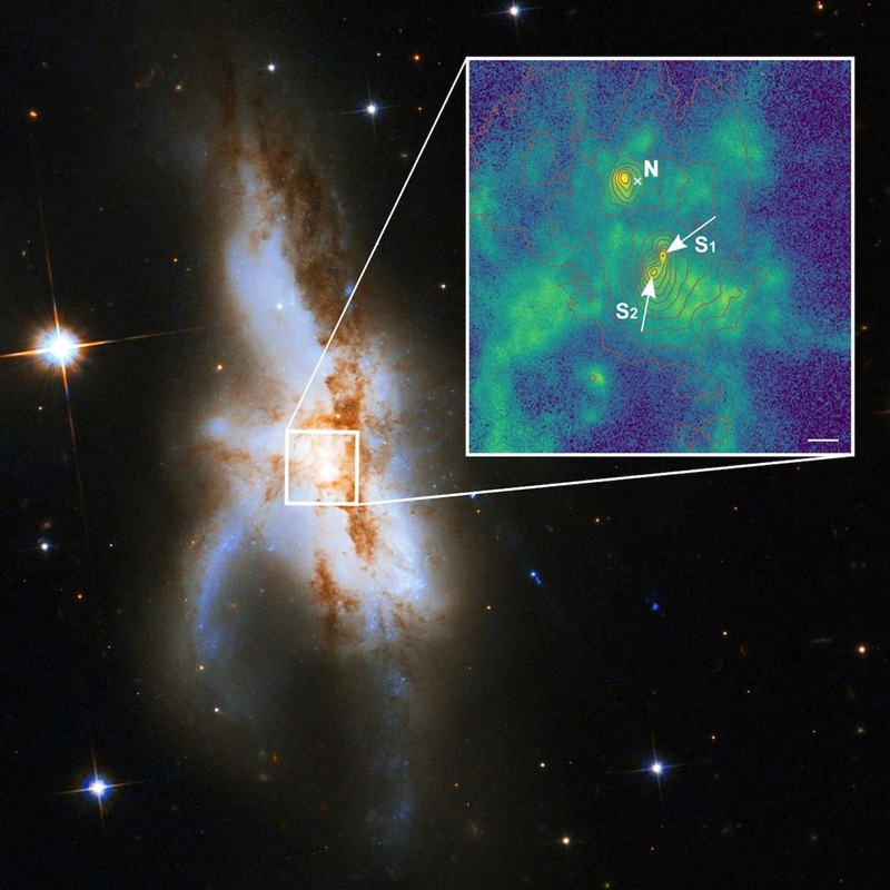 Αντ 'αυτού, όταν είδαν τον πυρήνα του NGC 6240 χρησιμοποιώντας τεχνικές χαρτογράφησης 3D, η ομάδα βρήκε απροσδόκητα τρεις υπερμεγέθεις μαύρες τρύπες - η κάθε μια έχοντας μάζα πάνω από 90 εκατομμύρια Ήλιους. (Για σύγκριση, η υπερμεγέθης μαύρη τρύπα στο κέντρο του Γαλαξία, Τοξότης A *, ζυγίζει περίπου 4 εκατομμύρια ηλιακές μάζες.) Επιπλέον, και οι τρεις μαύρες τρύπες του NGC 6240 βρίσκονται σε μια περιοχή μικρότερη από 3.000 έτη φωτός , η οποία είναι μικρότερη από το ένα τοις εκατό του μεγέθους του γαλαξία στο οποίο κατοικούν.